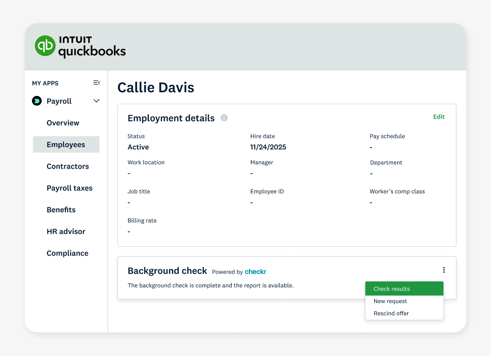 Hiring is getting harder for small and mid-sized employers, who face challenges ranging from labor shortages to complex compliance demands and lean HR teams. Too often, fragmented hiring systems slow hiring, add friction, and increase risk. That’s why we’re excited to announce that Checkr’s background check technology is now integrated directly into Intuit QuickBooks Online Payroll. (For larger organizations, Checkr is also available in Intuit Enterprise Suite.)