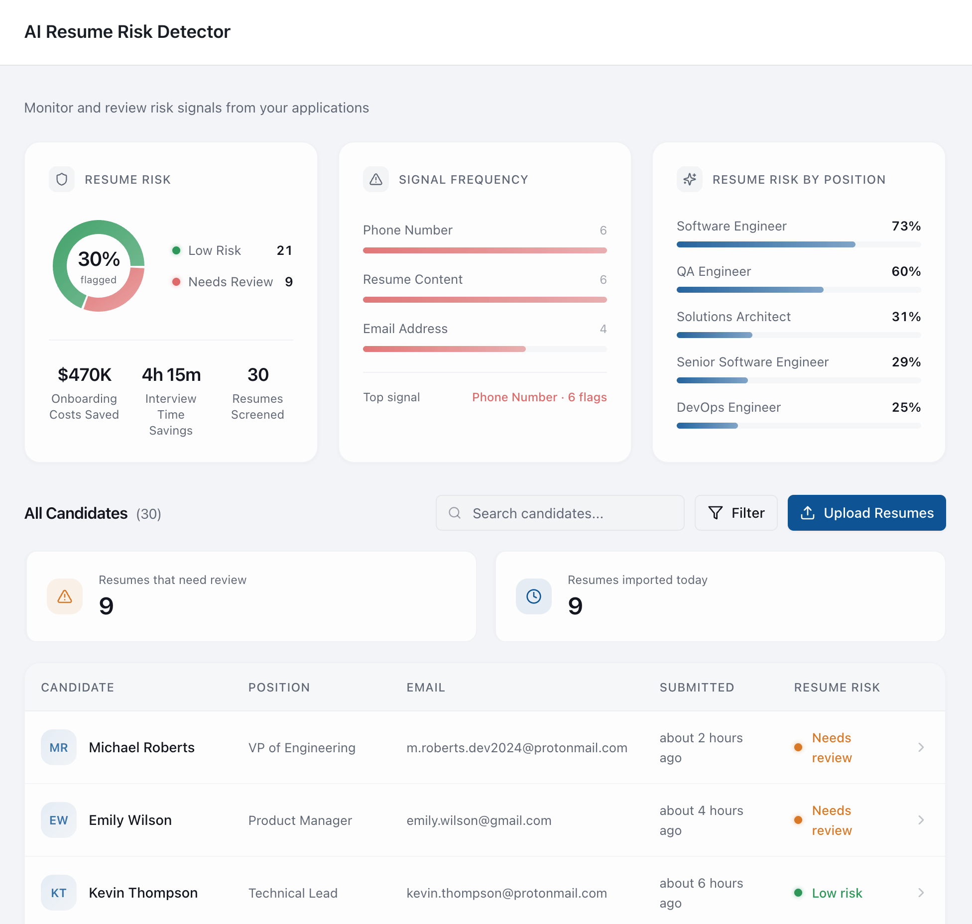 - Identify suspicious resumes instantly with clear, structured risk signals